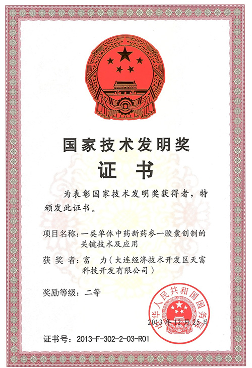 我公司拥有完全自主知识产权的一类中药单体新药参一胶囊“关键技术的创制及应用”项目,荣获2013年度国家科学技术发明二等奖,项目发明人富力博士获得了国家领导人的接见。