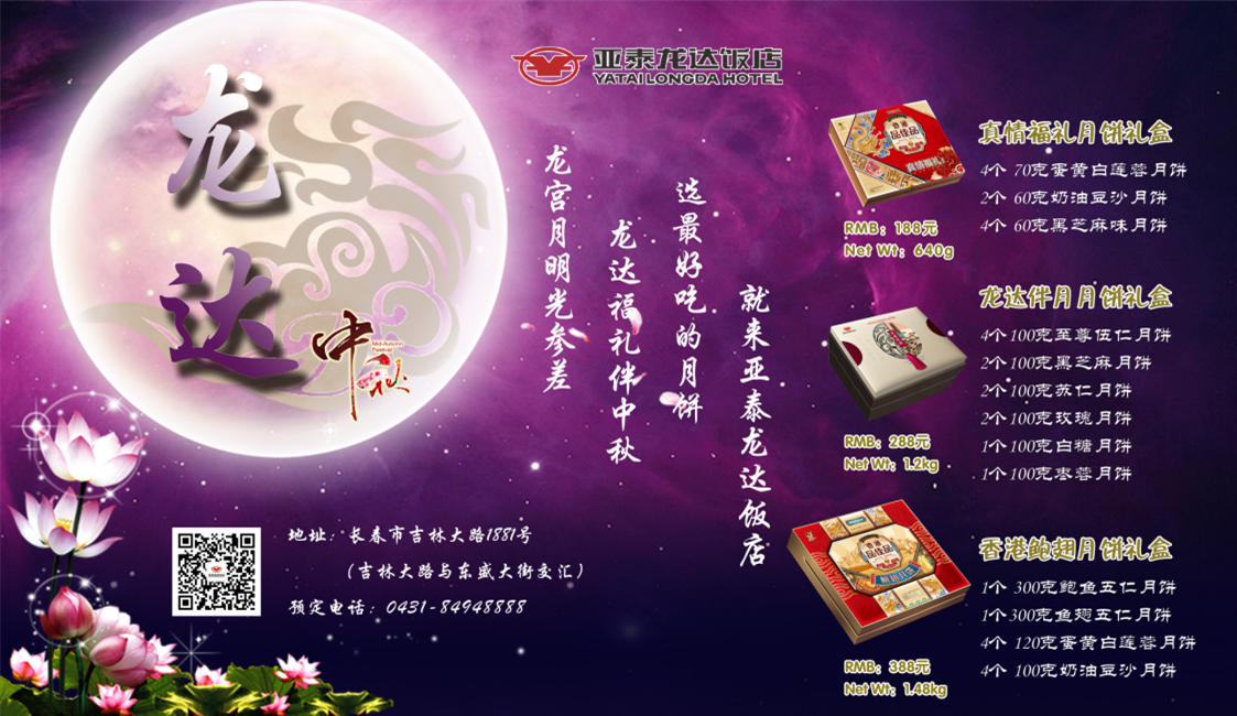 月儿圆圆,人团圆,值此中秋佳节之际,亚泰龙达饭店推出三款月饼礼盒,分别为真情福礼月饼礼盒(188元/盒),龙达伴月月饼礼盒(288元/盒),香港鲍翅月饼礼盒(388元/盒) ,其中融合香港风味及传统月饼口味,是您馈赠亲友的最佳选择!