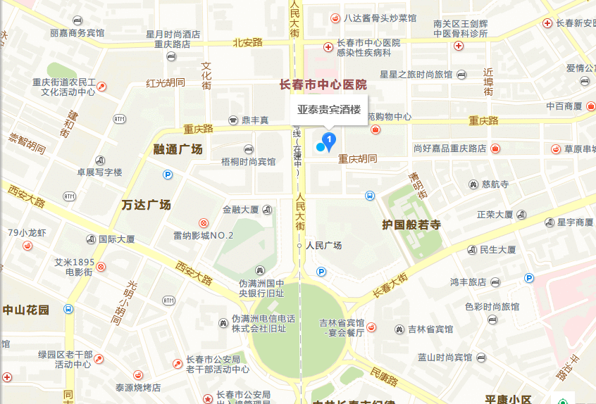 长春亚泰饭店位于长春市人民大街1968号,与重庆路交汇处,地理位置优越,交通便利,是长春市中心地段,繁华地段。