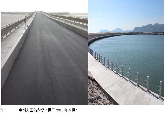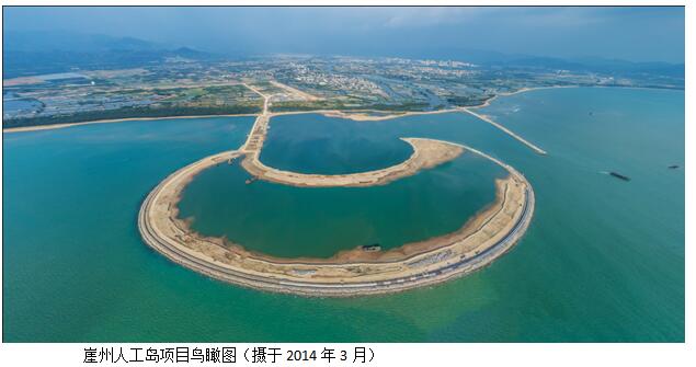 崖州项目于2012年9月份兴建, 2015年6月份完工,投资规模逾10亿元。填海面积51.38公顷(770亩),形成人工岛631亩。岛屿椭圆形状,长约1100米、宽约615米,轴向与岸线走向平行,距离海岸450米,通过引桥、引堤与崖州中心渔港项目商住用地相连。