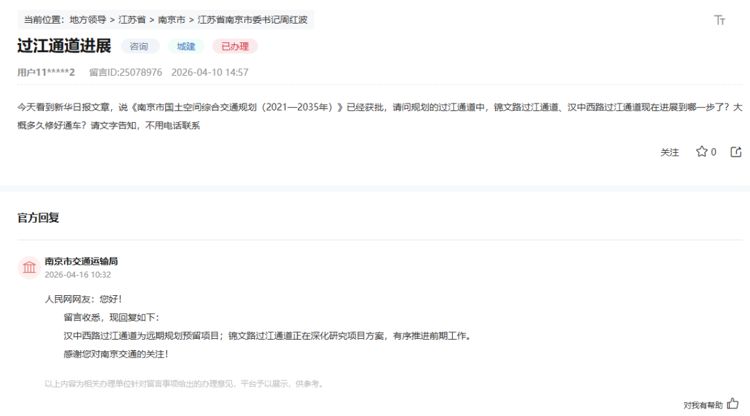 南京市交通运输局回复:汉中西路过江通道为远期规划预留项目;锦文路过江通道正在深化研究项目方案,有序推进前期工作。