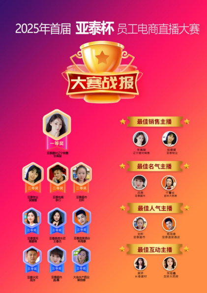 近日,2025年首届“亚泰杯”员工电商直播大赛在万众瞩目中重磅收官。这场历时60天的实战较量,宛如一场电商直播领域的盛大狂欢,自大赛启动以来,便如星星之火般点燃了亚泰集团员工的热情。