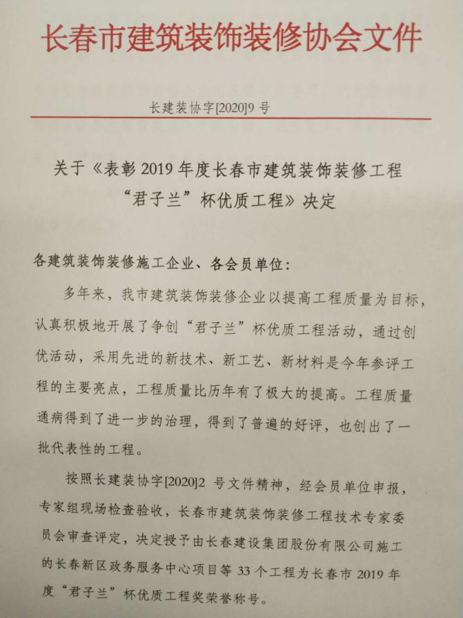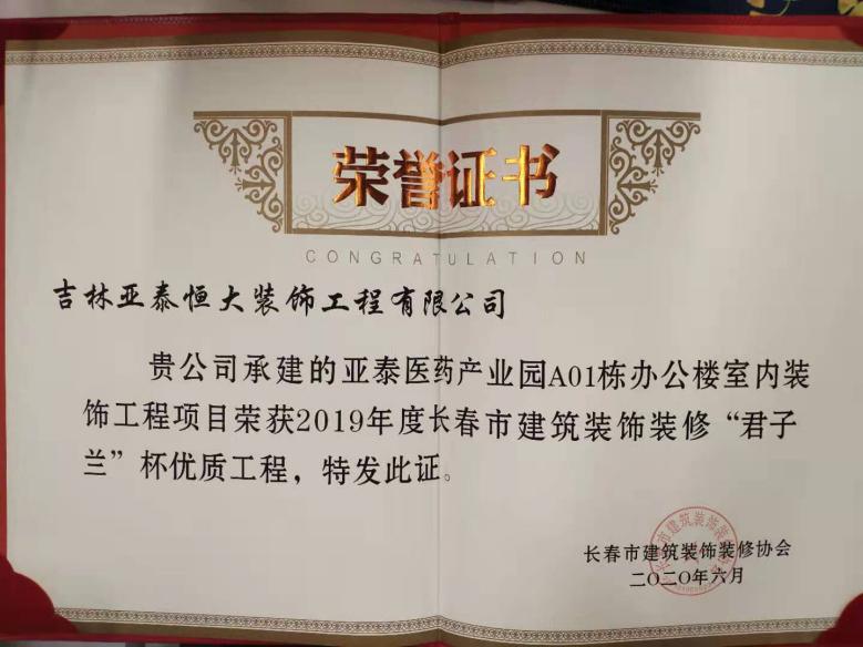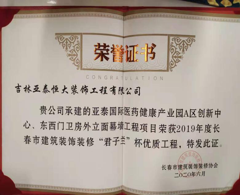 精工雕琢追寻品质经典,匠心打磨只为惊艳呈现。历经2020年这一不平凡的一年,我们迎来崭新的美好篇章。这一年,匠人们用心打造,项目团队用心付出,承建项目佳报频传。长春亚泰饭店室内改造装饰工程、亚泰医药产业园A01栋办公楼室内装饰工程、亚泰医药产业园A区创新中心、东西门卫房外立面幕墙工程纷纷继荣获“吉林省优质工程装饰奖”又再次斩获长春市“君子兰”杯优质工程奖。
