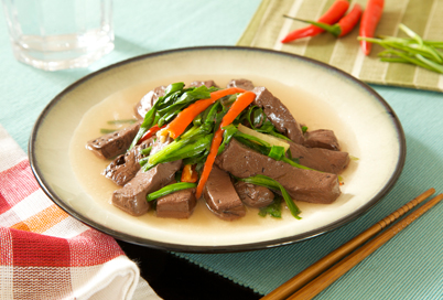 3、锅内注油,下入干辣椒丝、韭菜略炒,烹料酒,加鸭血、盐、味精炒匀,淋香油,出锅即成。