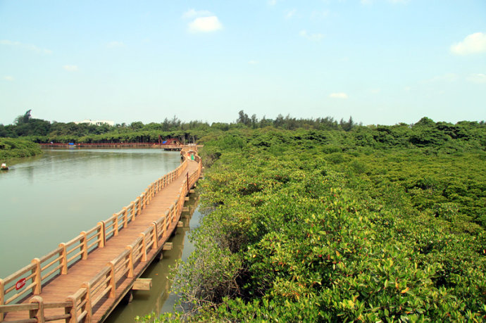 海口市东寨港红树林自然保护区距酒店54公里约70分钟车程。红树林是热带滨海泥滩上特有的常绿植物群落,由于其大部分树种都属于红树科,所以生态学上将其称为红树林。涨潮时分,茂密的红树林被潮水淹没,只露出翠绿的树冠随波荡漾,成为壮观的“海上森林”。东寨港红树品种主要有红海榄、木榄、尖瓣海莲、角果木、秋茄、白榄、海骨根、海漆、桐花树、老鼠勒、水柳、王蕊、海芒果等。红树林如同一道绿色的海上长城,有效地防止海潮大风对农田和村舍的侵袭,它的根深深地扎在泥土里,既可以保护泥土不被海潮冲走,又可以阻挡被雨水自陆地上冲刷下来的泥土。