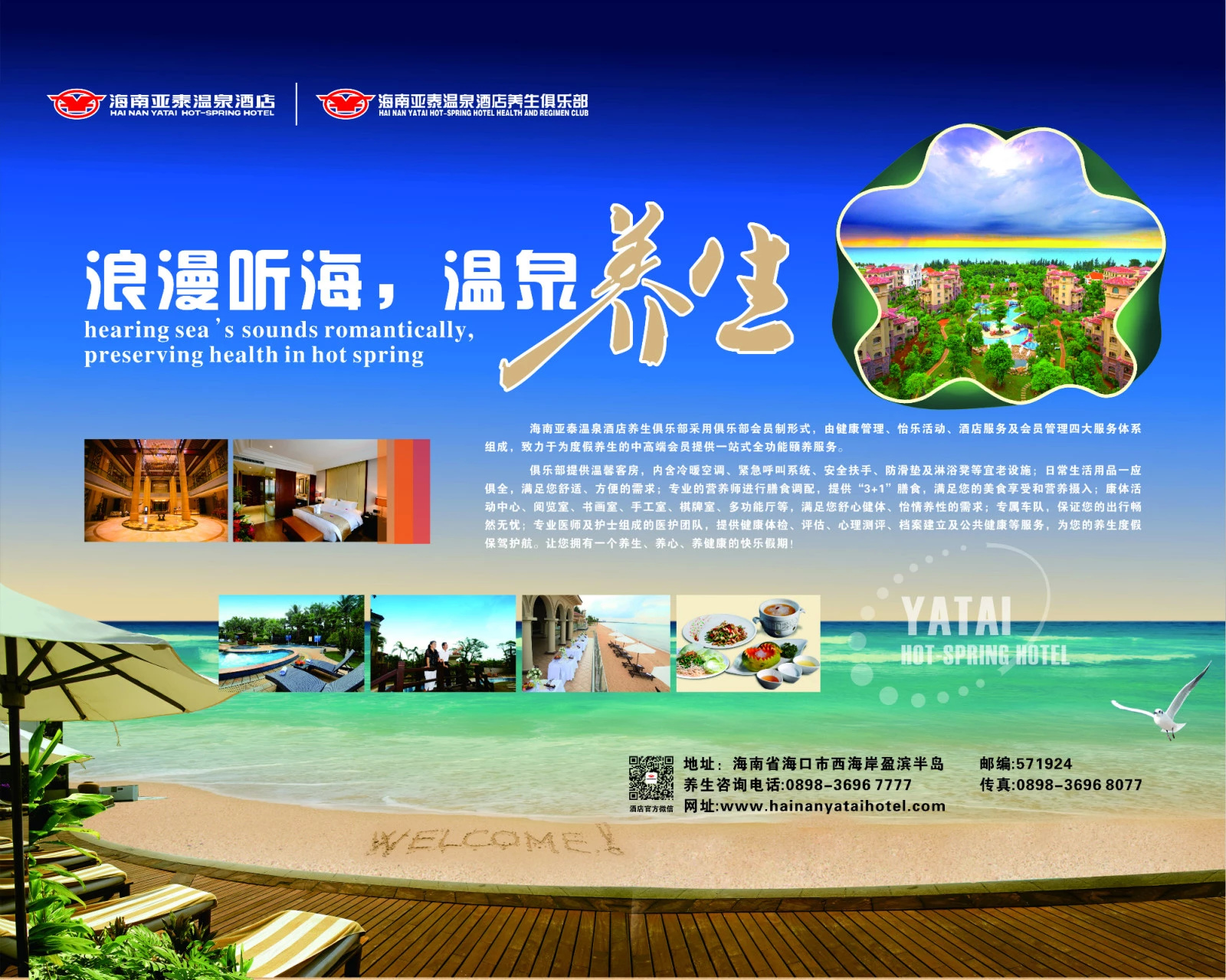 海南亚泰温泉酒店,是国家500强企业——吉林亚泰集团投资兴建的一家集客房、餐饮、会议、养生为一体的五星级滨海温泉度假酒店,位于风景秀丽的海南省西海岸盈滨半岛旅游风景区,占地面积7.01万㎡。亚泰温泉酒店养生俱乐部采用俱乐部会员制形式,由健康管理、怡乐活动、酒店服务及会员管理四大服务体系组成,致力于为度假养生的中高端会员提供一站式全功能颐养服务。让您拥有一个养生、养心、养健康的快乐假期!