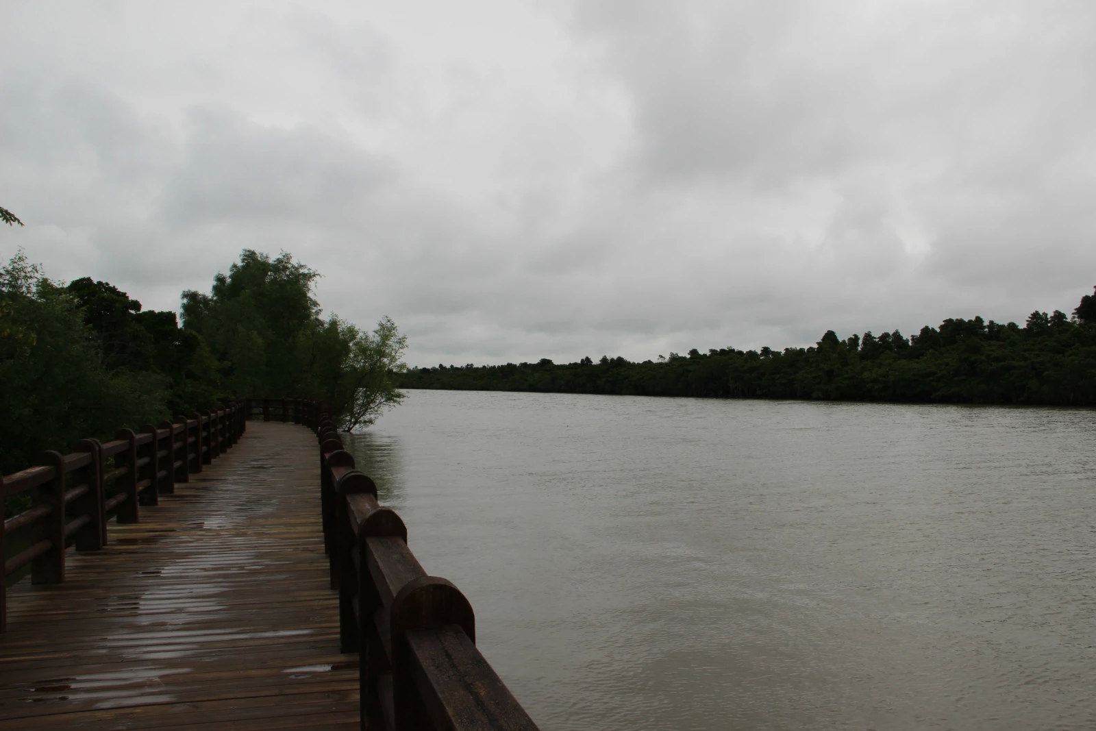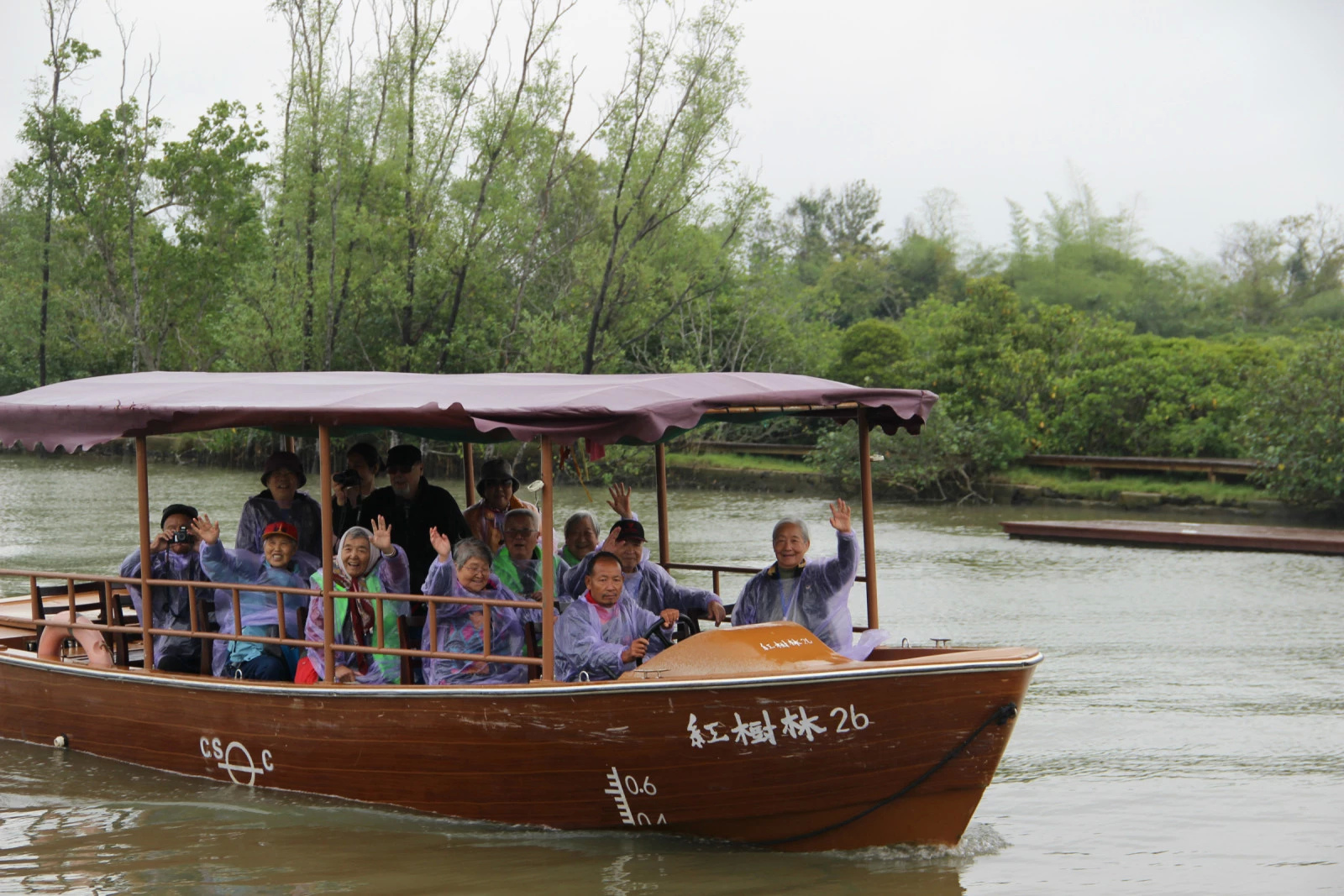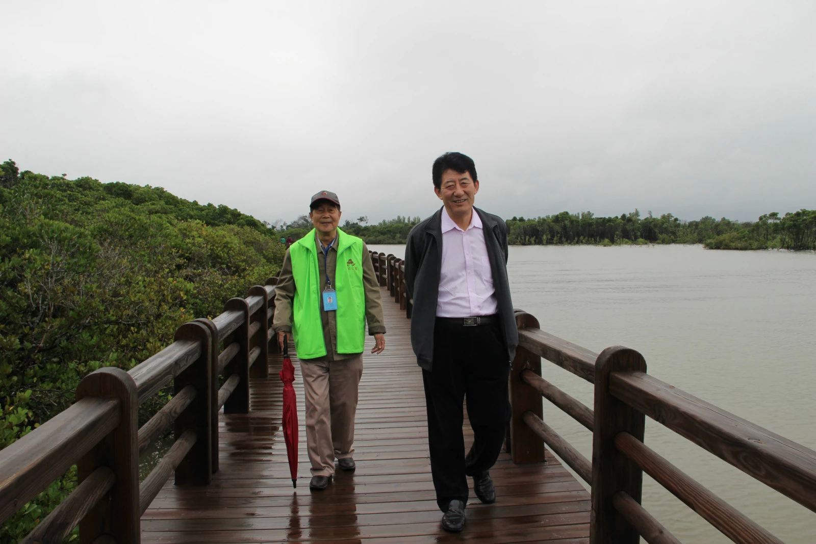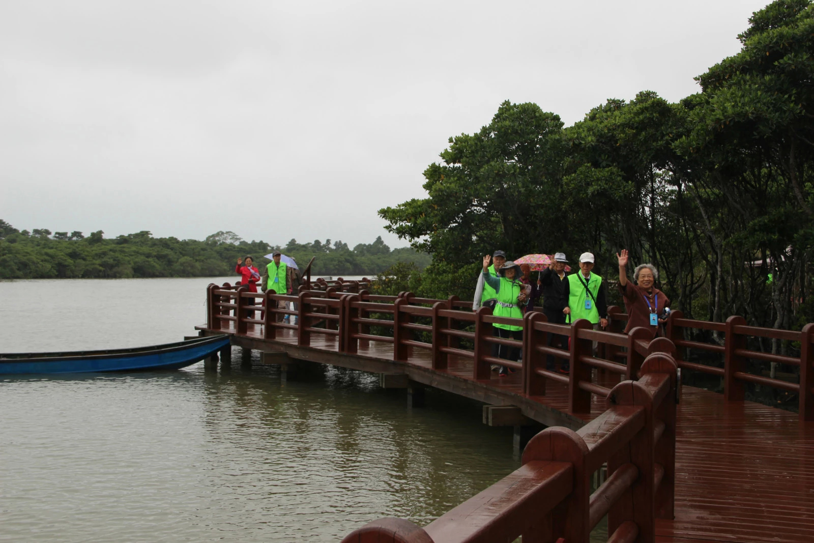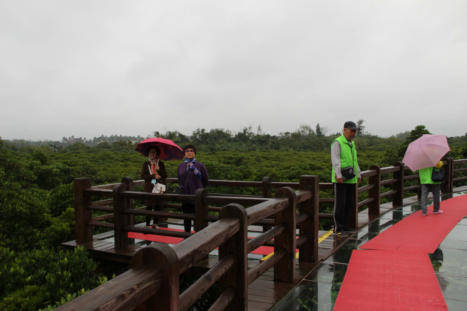 站在栈道上远眺,只见一片浩瀚的郁郁葱葱的绿色树林,迎着风雨在水中摇曳,亭亭玉立,风姿绰约,宛如一道永不凋零的绿色长城,在水中巍然屹立。望着如此美丽的自然风光,叔叔阿姨们全然忘记了蒙蒙细雨,争相拍照留念。
