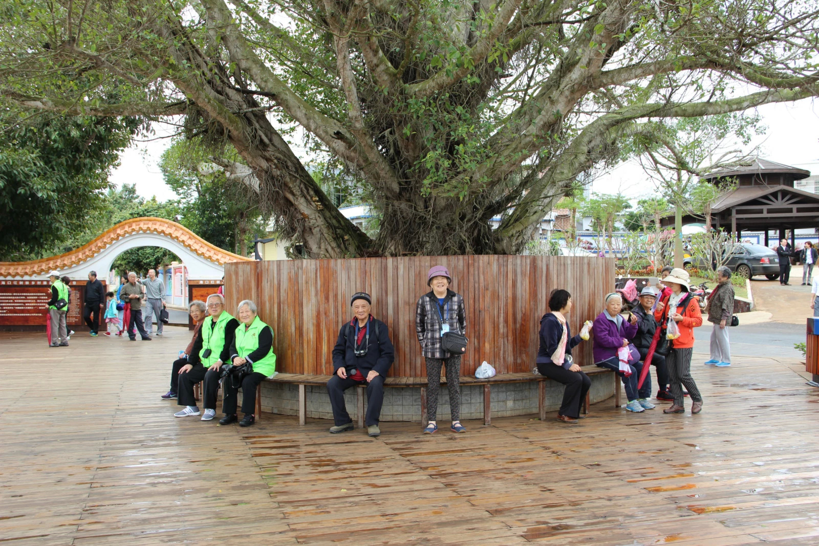 看看,双双对对的老夫妻在牛毛细雨中漫步栈道,不失为一种浪漫情怀。