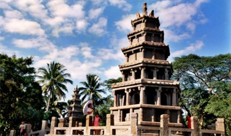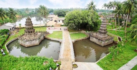 位于澄迈县金江镇美榔村的美榔双塔,始建于宋朝,至今已有800多年的历史,是国家一级重点文物保护单位。美榔双塔分姐妹两塔,姐塔为六角七层、高13.6米;妹塔四角七层、高12.55米。双塔塔身造型美观,匠工精巧,加之周围林木苍翠,景致相当优雅。美丽的美榔姐妹塔还流传着这样感人的民间传说:相传很久以前,陈家有两女,灵照和善长,生得眉目清秀,心地善良,少年出家居庵当尼姑。一天,姐妹俩在村前冒泉的山池间发现了椰子“聚宝盆”,从此便常常从盆里取出米面金银分发给穷苦的乡邻。陈家姐妹俩的善良和美德感动了上天,姐妹仙逝后,上天派天工仙匠下凡来,开山凿石,造成了两座石塔。于是人们便在双石塔东边仙寿庵里,塑造陈家姐妹俩的神像,祭祀纪念。