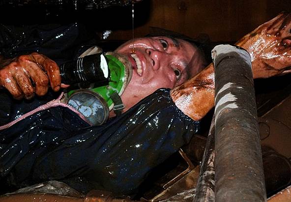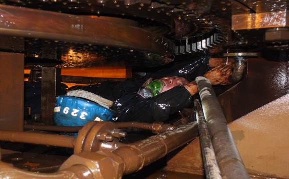 2、这是2013年7月25日,维修工人钻进狭小充满润滑油的原料立磨减速机内对断开油管进行抢修安装的全景。(摄影:姚希彬)
