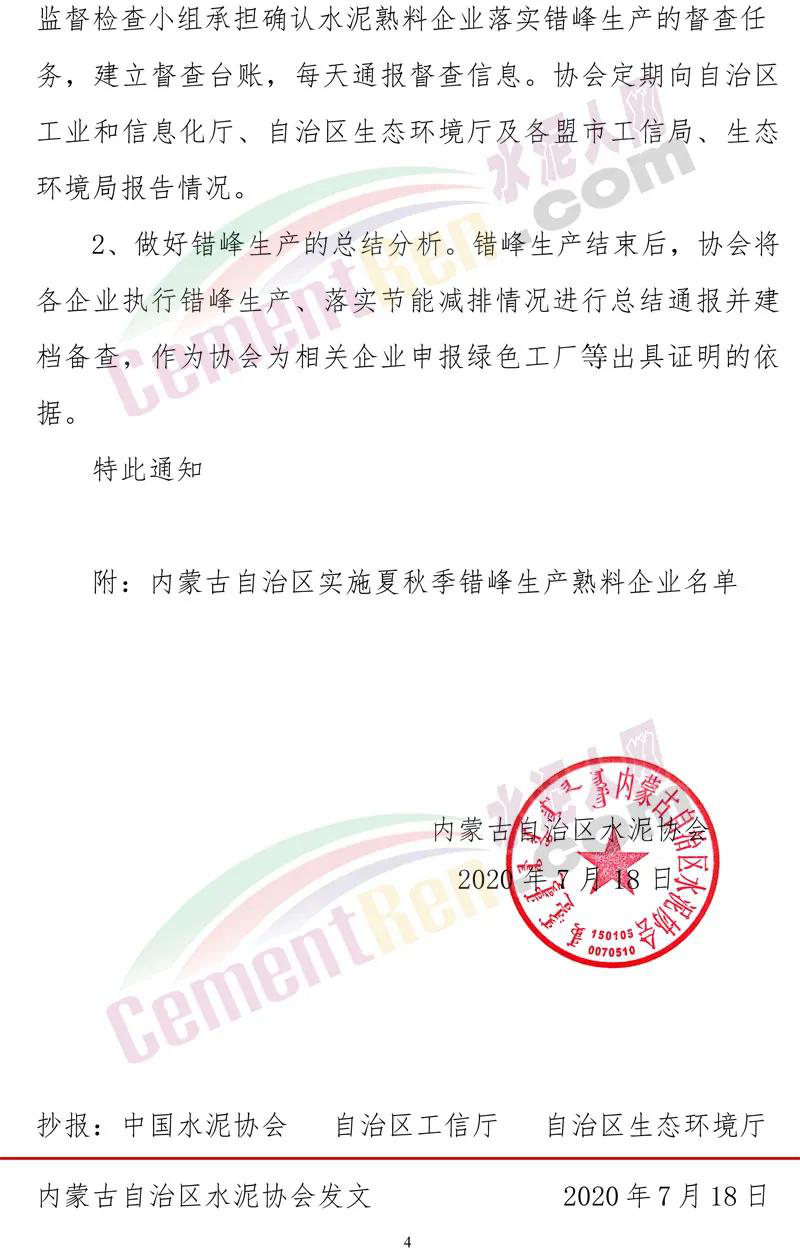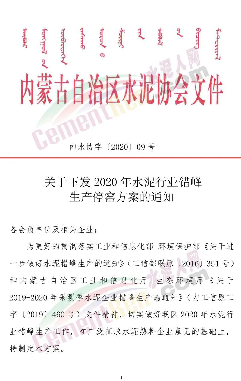 日前,内蒙古自治区水泥协会发布《2020 年水泥行业错峰生产停窑方案的通知》要求自治区境内所有水泥熟料生产线根据实际情况开展夏秋季错峰生产工作,并提出了错峰原则。