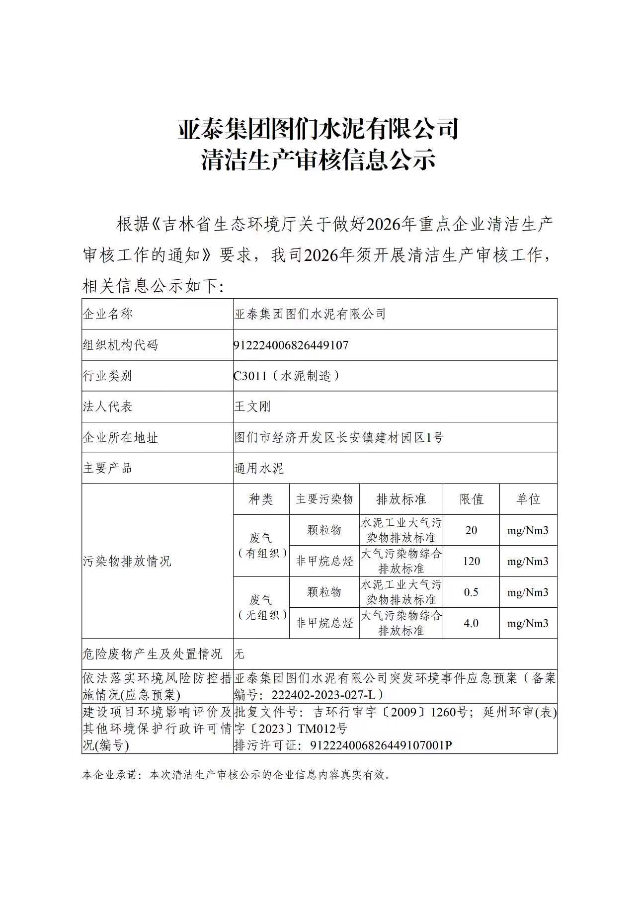 亚泰集团图们水泥有限公司清洁生产审核信息公示