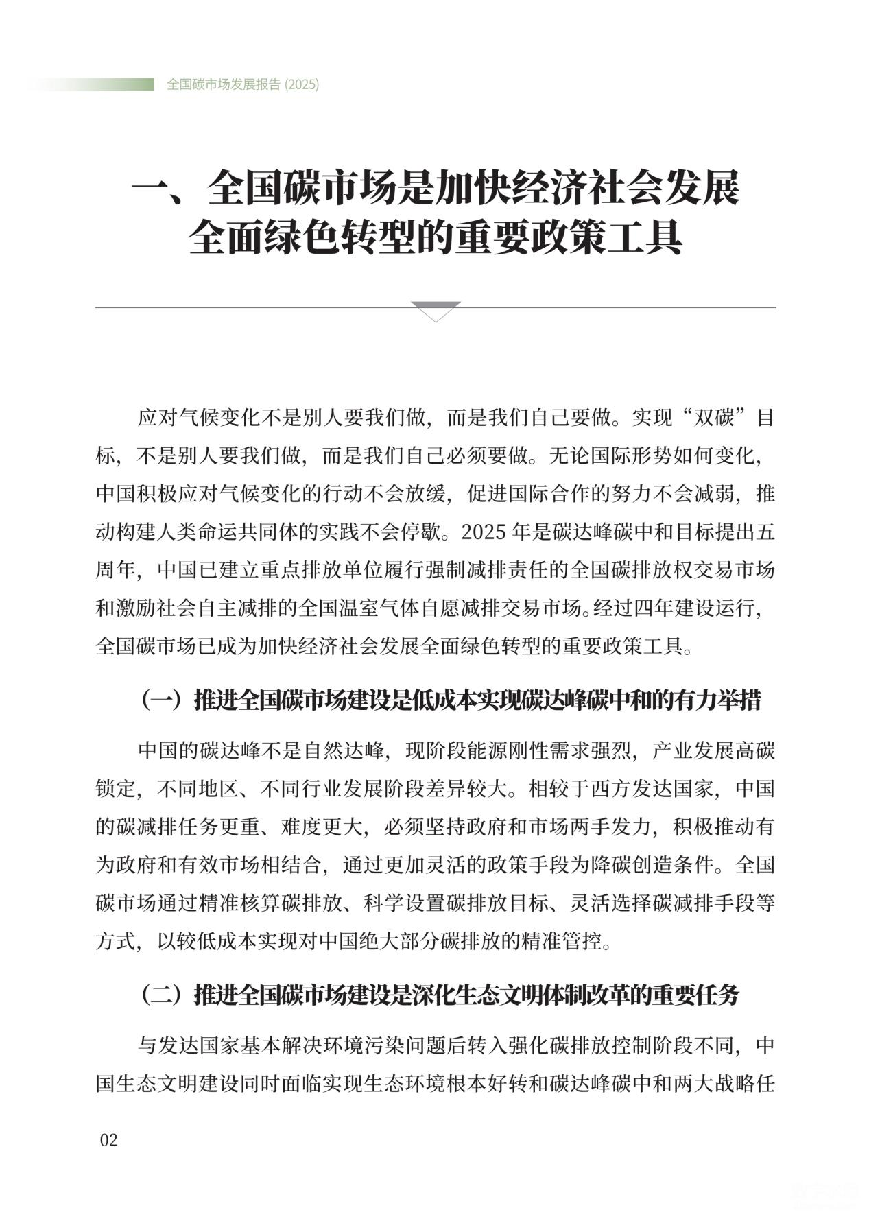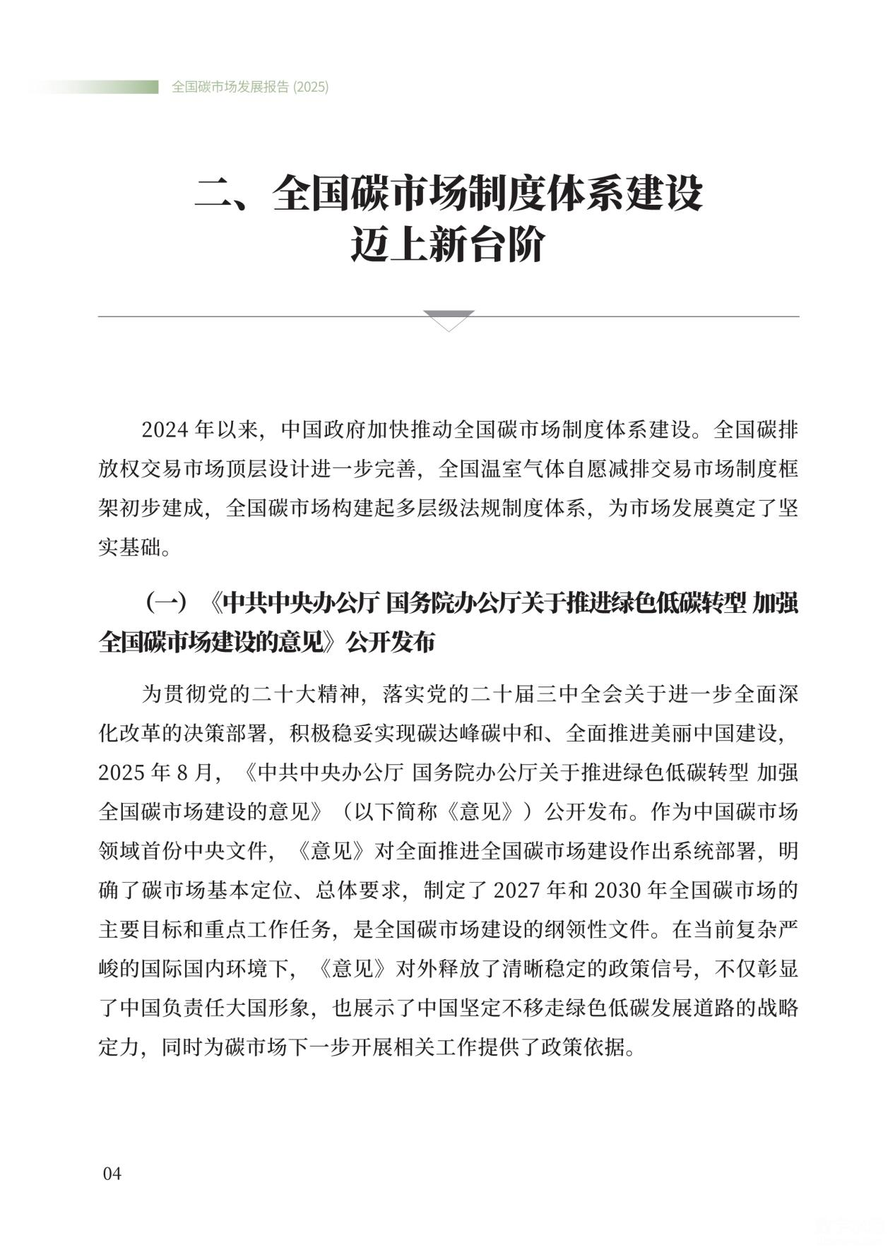 《全国碳市场发展报告(2025)》系统总结了全国碳排放权交易市场和全国温室气体自愿减排交易市场的最新建设进展,全方位展示了市场建设运行成效,展望了全国碳市场未来发展方向,是继2024年《全国碳市场发展报告(2024)》之后,生态环境部发布的全国碳市场最新进展情况报告。