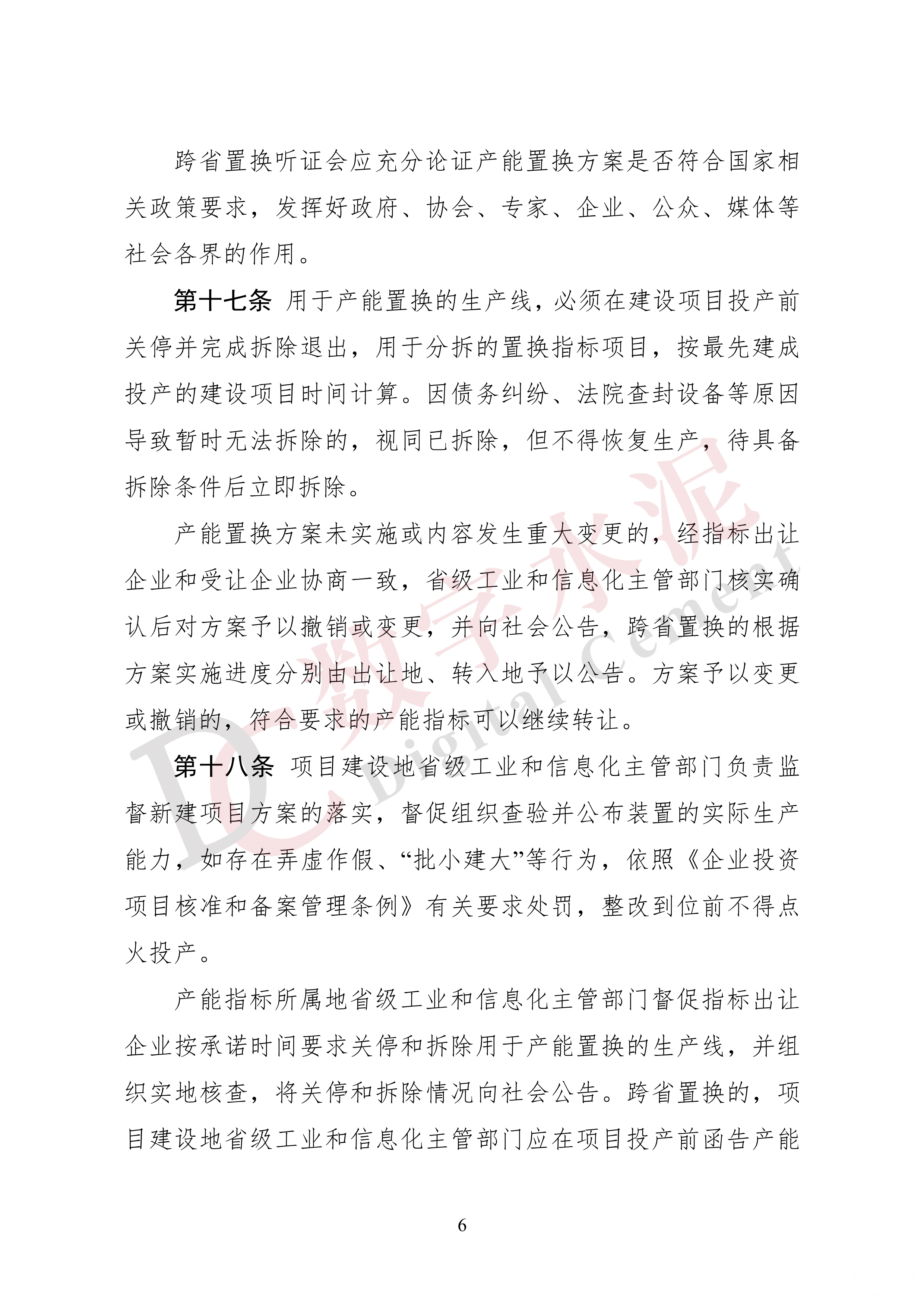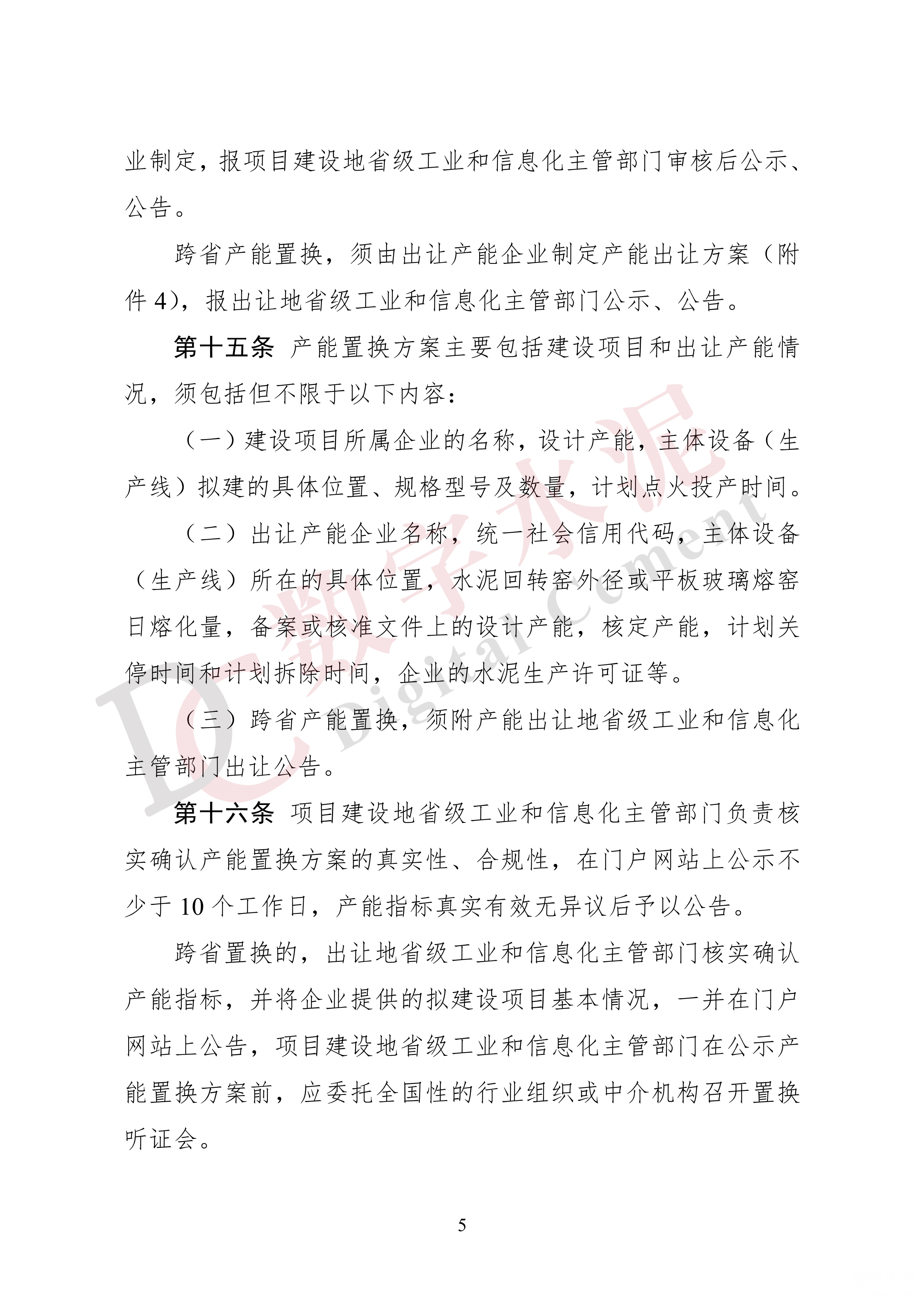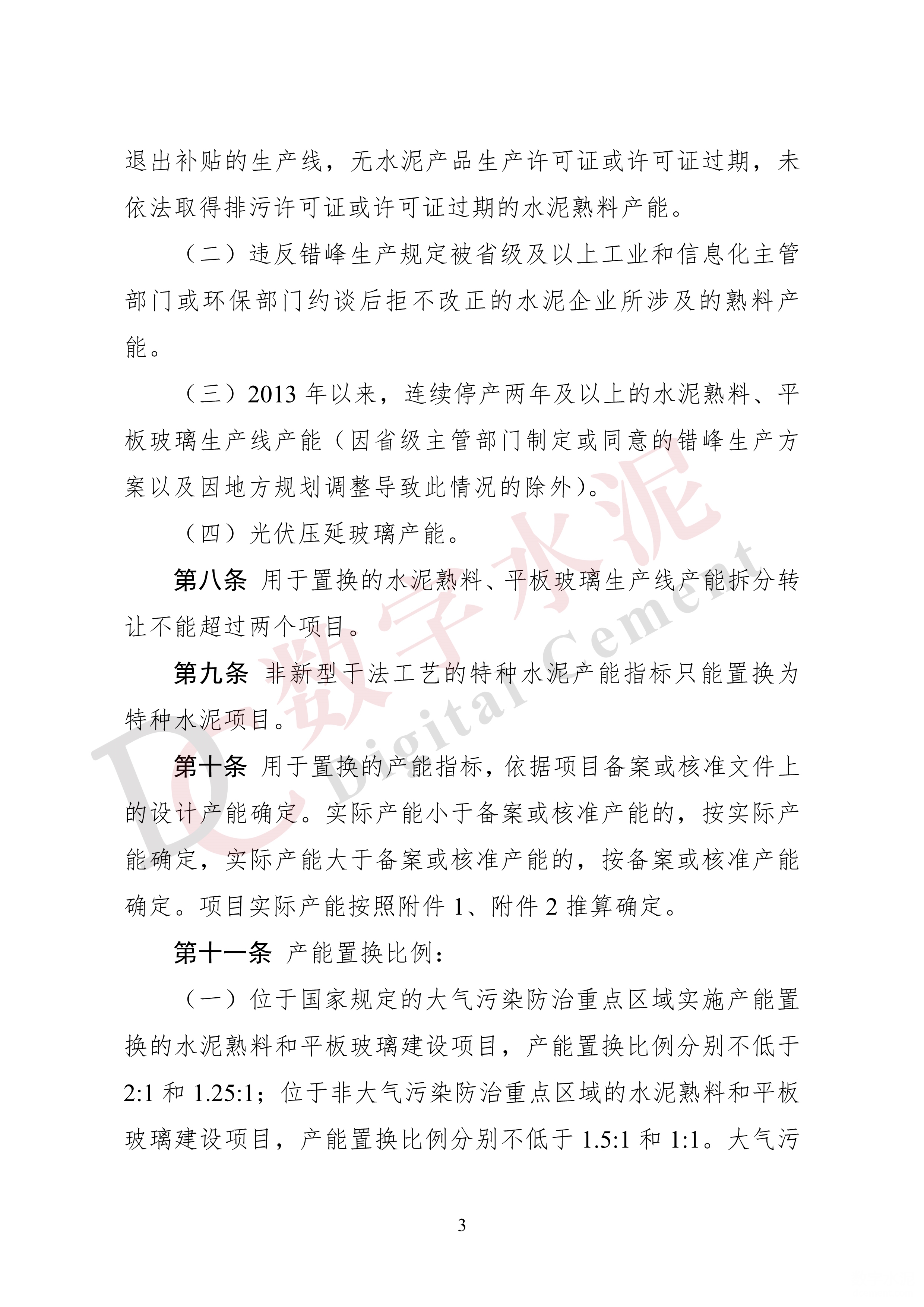 (二)产能指标的认定更加严格。一是强调了产能指标必须在各省按年度更新并公告的本地区生产线清单内。二是为避免“僵尸产能”复活,规定连续停产两年及以上的水泥熟料、平板玻璃生产线不能用于产能置换。三是明确跨省置换应召开听证会,接受公众和媒体监督。