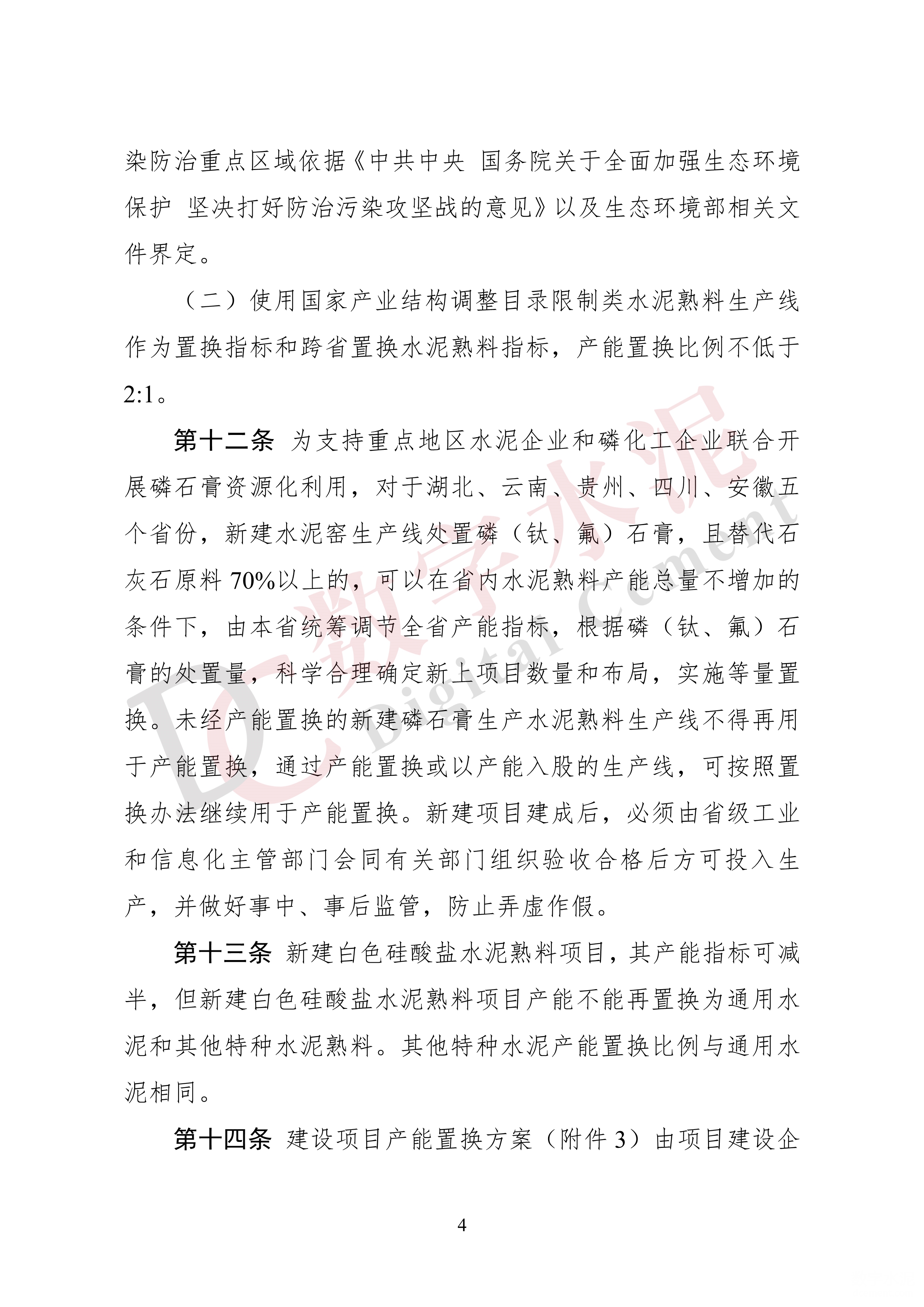(一)置换比例和置换范围根据新形势做了调整。一是提高了水泥项目产能置换比例,大气污染防治重点区域水泥项目由1.5:1调整至2:1,非大气污染防治重点区域由1.25:1调整至1.5:1。二是加大低效产能压减力度,对产业结构调整目录限制类的水泥产能以及跨省置换水泥项目,产能置换比例一律不低于2:1。三是鼓励固废综合利用,湖北、贵州等五省磷(钛、氟)石膏生产水泥项目产能可实施等量置换。四是保障光伏发展需要,新上光伏压延玻璃项目不再要求产能置换。