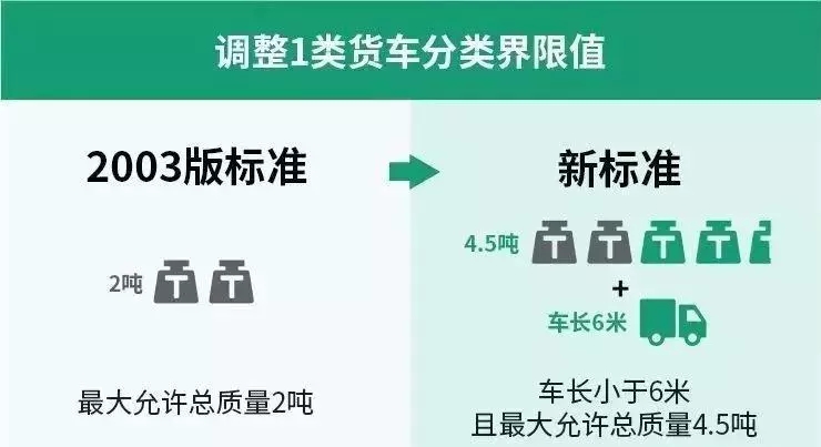 新的车型划分标准中,将1类和2类货车分类界限值,确定为车长小于6米且允许总质量4.5吨。