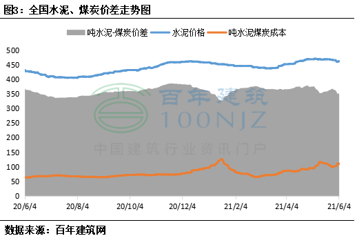 截至6月4日,二季度水泥-熟料价格差月度均值为366.1元/吨,同比2020年下跌0.88%。二季度属于传统水泥旺季,但雨季来临,下游需求减弱,水泥价格涨跌互现,港口动力煤价格高位运行,为水泥价格提供一定支撑,二季度跌幅同比收窄,行业利润环比呈上行趋势。