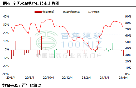 概述:本周全国料线运转率72.22%,较上周下降7.27%,全国平均熟料库容比为63.95%,较上周上升1.54%,全国水泥价格涨跌互现,截止6月4日,百年建筑网水泥价格指数为499.66点,较上周508.13环比下跌1.67%。