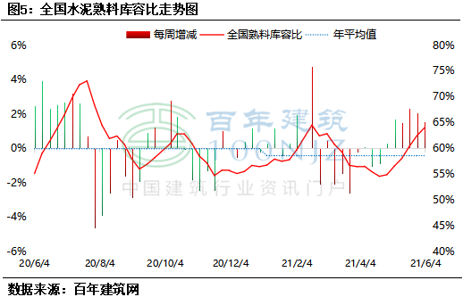 库存方面:全国平均熟料库容比为63.95%,较上周上升1.54%。本周华东地区熟料库容比较上周上升2.62%,主要因为浙江、江苏一带近期雨水天气增多,下游市场需求低迷,厂家熟料库存快速回升;西南地区熟料库容比较上周上升1.31%,主要因为重庆地区进入高温多雨季节,水泥需求量明显下降,多个厂家库存持续上升,部分企业库满停窑;华南地区熟料库容比较上周下降1.52%,主要因为广西地区前期部分水泥企业降价促销,水泥销量有所增加,库存有所下降;其他区域波动较小。