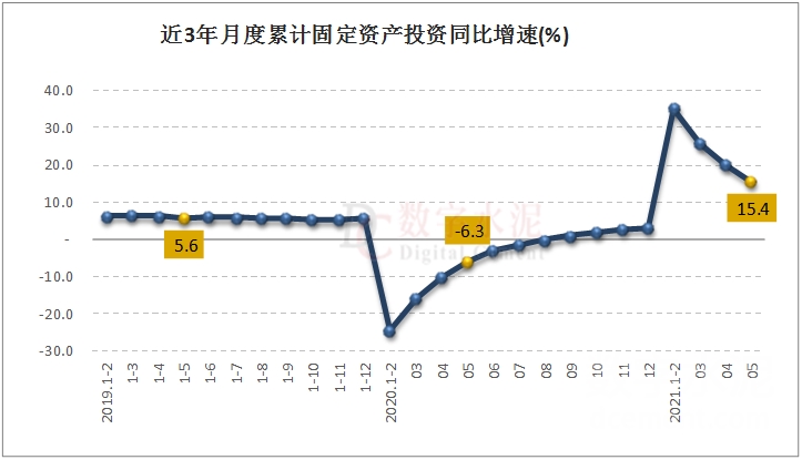 2021年1-5月,全国固定资产投资(不含农户)19.39万亿元,同比增长15.4%,上年同期为下降6.3%,较2019年1-5月份增长8.5%,两年平均增长4.2%。从单月投资来看,5月份固定资产投资(不含农户)环比增长0.17%。