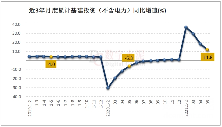 2021年1-5月,全国基础设施投资(不含电力)同比增长11.8%,上年同期为下降6.3%,两年平均增长2.6%。其中,铁路运输业投资增长7.1%;道路运输业投资增长10.6%;水利管理业投资增长15.4%。