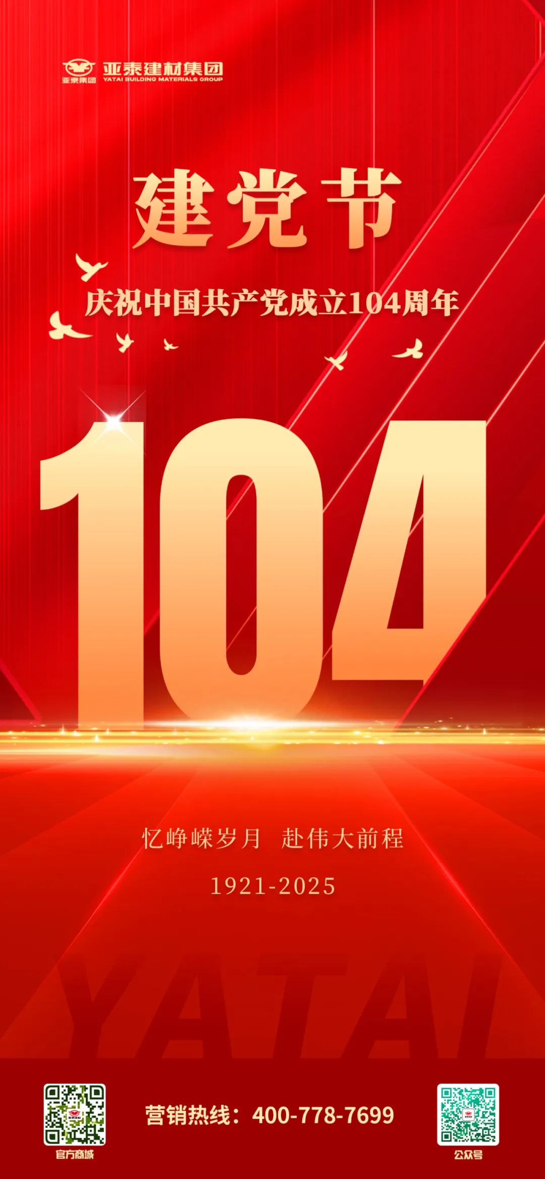 从1921到2025,104 载风雨兼程,中国共产党带领人民书写壮丽史诗。亚泰建材集团与时代同行,值此建党节,以初心致敬信仰,以实干奔赴前程。