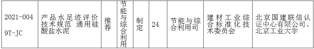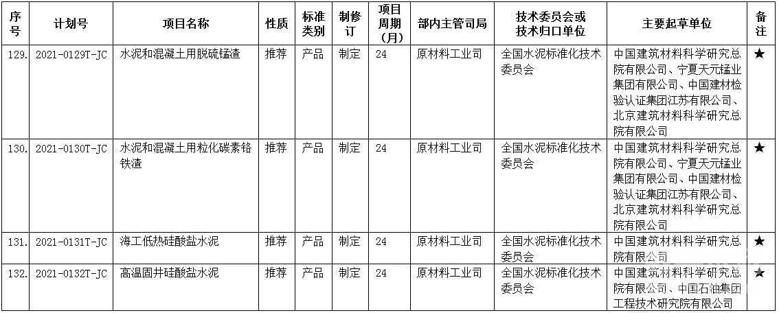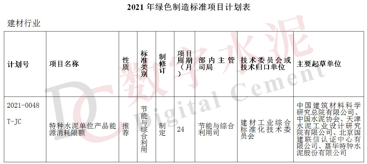 最新消息,在工业和信息化部办公厅印发2021年第一批行业标准制修订和外文版项目计划的通知中,特种水泥单位产品能源消耗限额、产品水足迹评价技术规范通用硅酸盐水泥列入2021年绿色制造标准项目计划表;水泥和混凝土用脱硫锰渣、水泥和混凝土用粒化碳素铬铁渣、海工低热硅酸盐水泥、高温固井硅酸盐水泥列入2021年质量提升标准项目计划表。水泥行业相关内容如下: