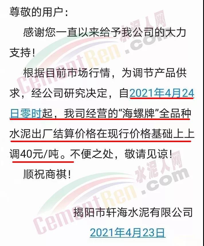 揭阳市轩海水泥有限公司通知自4月24日零时起,公司经营的“海螺牌”全品种水泥出厂结算价格在现行价格基础上上调40元/吨。