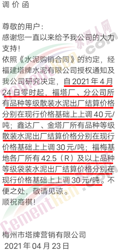 梅州市塔牌营销有限公司通知,依照《水泥购销合同》的约定,经福建塔牌水泥有限公司授权通知及我公司研究决定,自4月24日零时起,福塔厂、分公司所有品种等级散装水泥出厂结算价格分别在现行价格基础上上调40元/吨;鑫达厂、金塔厂所有品种等级散装水泥出厂结算价格分别在现行价格基础上上调30元/吨;福梅基地各厂所有42.5(R)及以上品种等级袋装水泥出厂结算价格分别在现行价格基础上上调30元/吨。
