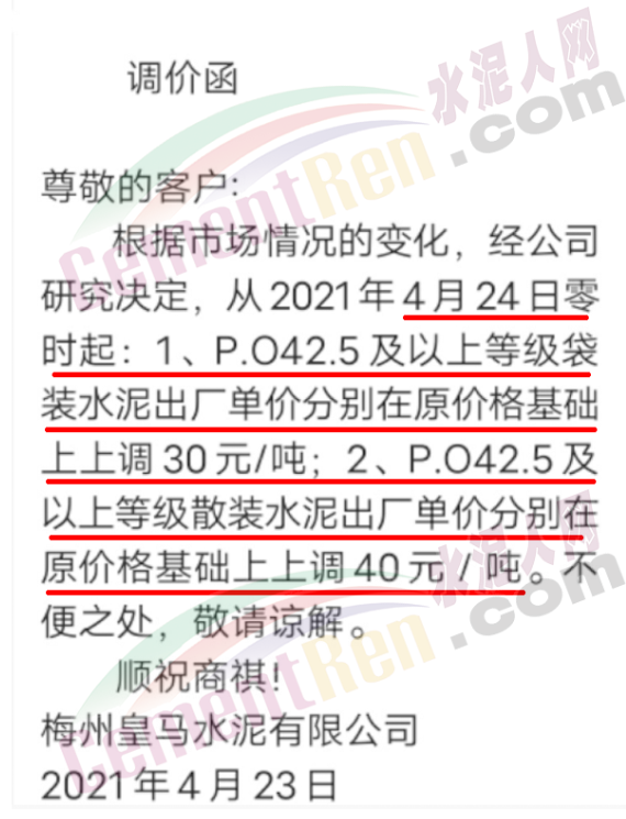 梅州皇马水泥有限公司通知,从2021年4月24日零时起,P.O42.5及以上等级袋装水泥出厂单价分别在原价格基础上上调30元/吨;P.O42.5及以上等级散装水泥出厂单价分别在原价格基础上上调40元/吨。