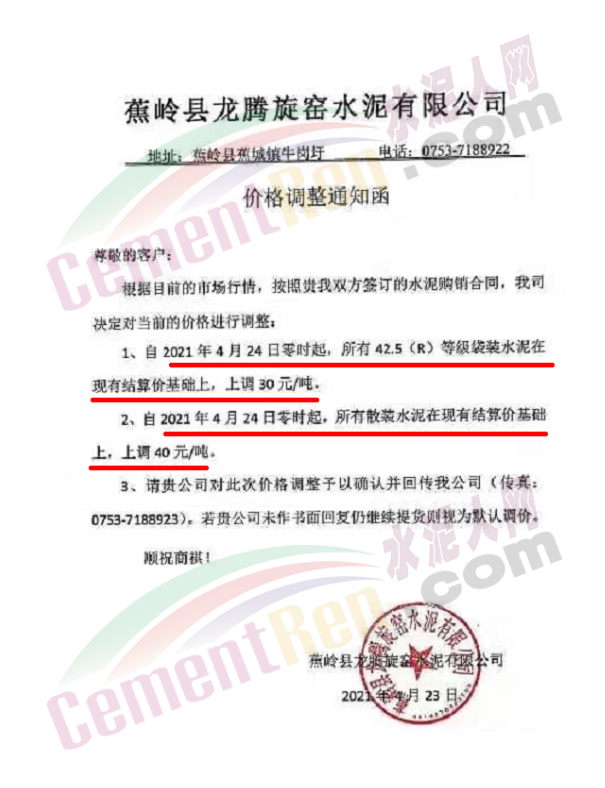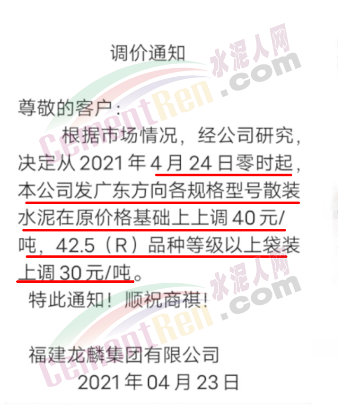 福建龙麟集团有限公司通知从4月24日零时起,发广东方向各规格型号散装水泥在原价格基础上上调40元/吨,42.5(R)品种等级以上袋装上调30元/吨。