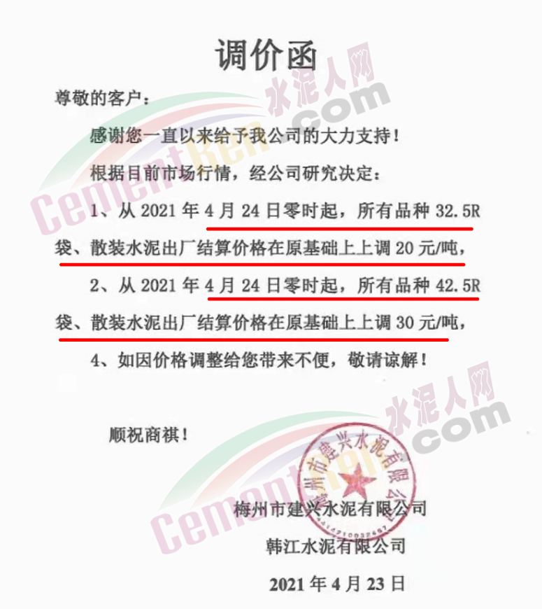 梅州市建兴水泥有限公司韩江水泥有限公司通知,从4月24日零时起,所有品种32.5R袋、散装水泥出厂结算价格在原基础上上调20元/吨,从4月24日零时起,所有品种42.5R袋、散装水泥出厂结算价格在原基础上上调30元/吨。
