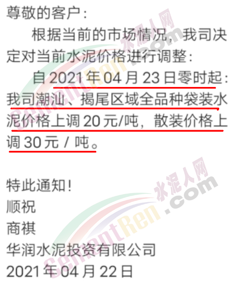 华润水泥投资有限公司通知自4月23日零时起,公司潮汕、揭尾区域全品种袋装水泥价格上调20元/吨,散装价格上调30元/吨。