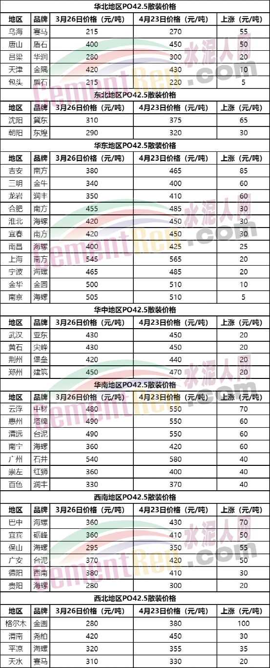 备注:以上信息来源于水泥人网信息中心,仅供参考,如有差池请以实际报价为准!