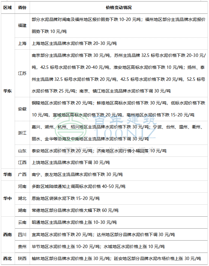 下周预测:本周华东市场行情价格持续走弱,预计下周华东地区水泥价格偏弱运行;华北市场行情持稳运行,预计下周报价保持坚挺;西南地区水泥价格涨跌互现,预计下周市场行情震荡偏弱;东北地区水泥市场价格保持稳定,预计下周持稳为主;华南部分地区水泥价格继续下行,预计下周市场行情继续走弱;华中地区市场行情涨跌互现,预计下周震荡运行;西北地区行情小幅上涨,预计下周市场行情涨跌互现运行。