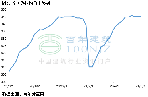 熟料价格:全国熟料均价344.9元/吨,较上周下跌0.2元/吨,跌幅0.05%,总体呈下跌趋势。由于华东地区即将进入梅雨季节,市场需求有所回落,外来熟料价格已率先下跌15-20元/吨。本地熟料价格暂稳运行,近期或跟进下跌;华南广东地区近期受高温多雨天气影响,下游需求不佳,叠加外来低价熟料进入量增加,市场竞争压力较大,熟料价格下跌20元/吨;此外西南重庆地区近期同样受雨水天气影响,本地市场竞争较为激烈,熟料价格小幅下跌5元/吨。而云南玉溪、保山部分地区由于区域内实行限电措施,熟料产能受限,熟料价格上涨20元/吨。