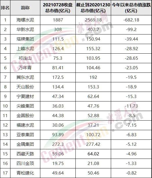 今年以来从总市值涨跌榜来看,不仅海螺水泥,上市公司水泥板块绝大多数企业也处于“跌势”,曾经总市值达到2569.18亿元排名第一的海螺水泥从“赚钱王”变成了今天市值蒸发的“跌冠”。