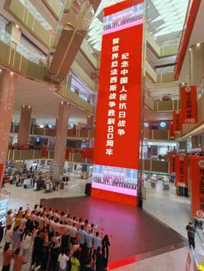 亚泰新动力购物中心充分利用公共空间优势,通过户内外高清大屏同步直播阅兵盛况。震撼的阅兵画面吸引了众多员工和市民驻足观看,大家共同见证这一庄严的历史时刻。