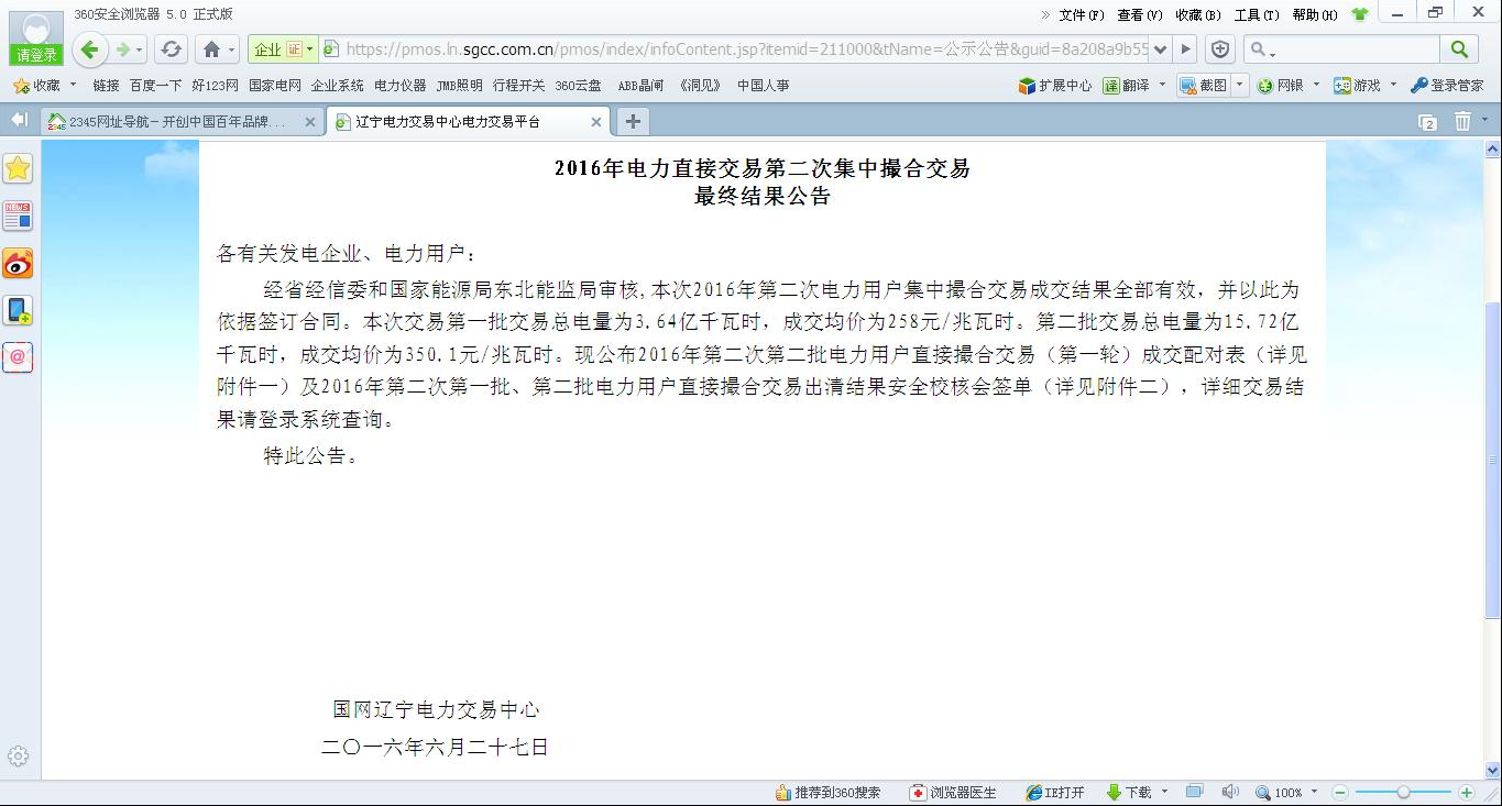 在2016年7月进行的第三次电力直接交易中,经过公司相关人员对电力直接交易规则透彻的分析,成功成交下半年直接交易电量16626MWh,为公司节约电费60多万元,本次参加电力直接交易电力用户300多家,仅24家电力用户中标,竞争激烈,我公司获得本次电力直接交易机会确实可喜可贺,凝聚着本溪公司员工的智慧与汗水. 为公司取得了可以争取到的最大利益。
