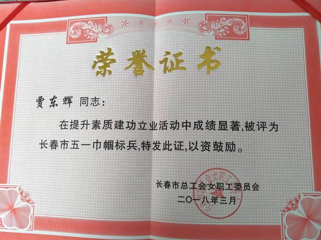 近日,吉林亚泰水泥有限公司女工贾东辉获得了长春市总工会女工委员会授予的“长春市五一巾帼标兵”称号。