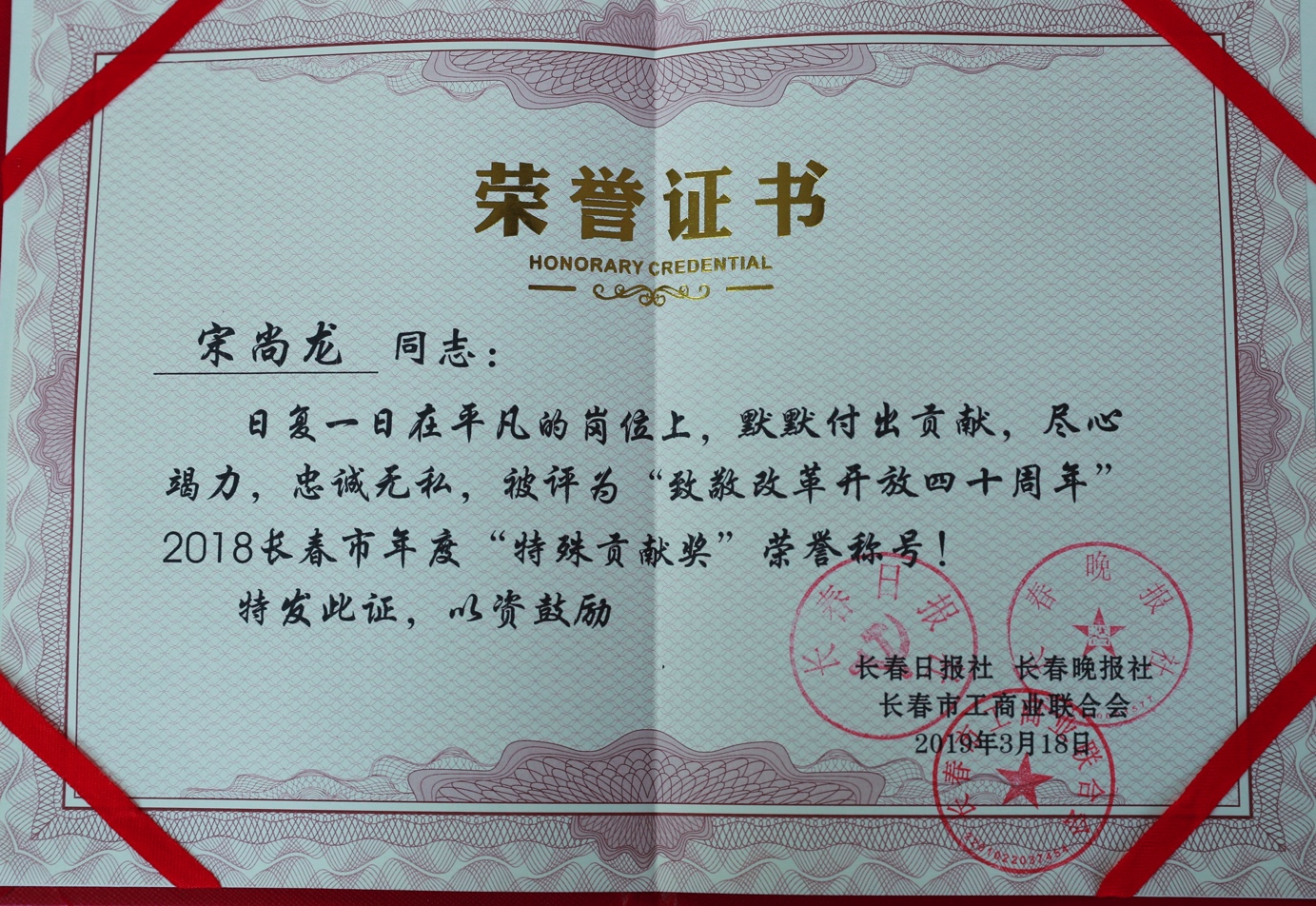 2019年5月22日,由长春日报社、长春晚报社、长春市工商业联合会联合开展的“致敬改革开放四十周年”2018长春市年度“优秀民营企业家、一带一路丝路明星、优秀企业中介服务机构”大型活动颁奖仪式在长春商会大厦举行。参与评选并最终获奖的长春市优秀企业家和企业代表参会。