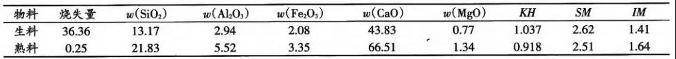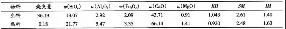 行配料,为改善熟料结粒,配料方案使用中饱和比和硅率,熟料三率值设计为:KH=0.920±0.02、SM=2.50±0.02、IM=1.65±0.02,但从生产情况来看,未达到预期效果。生产中原材料化学成分及配比见