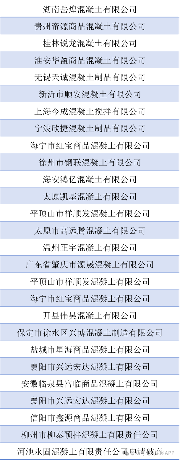 此外,据中国混凝土网报道,今年以来已有近30家混凝土企业被申请破产,名单如下: