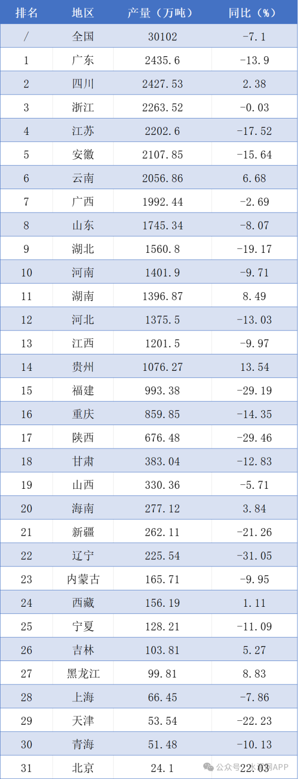 从分省市数据来看,一季度广东以产量2435.60万吨位列第一,四川产量2427.53万吨排在第二,浙江产量2263.52万吨排在第三。