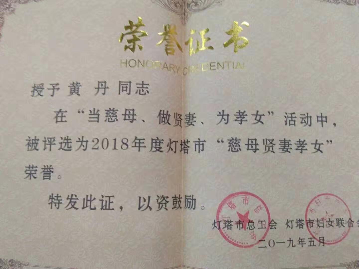 黄丹荣获灯塔市2018年度“慈母贤妻孝女”荣誉