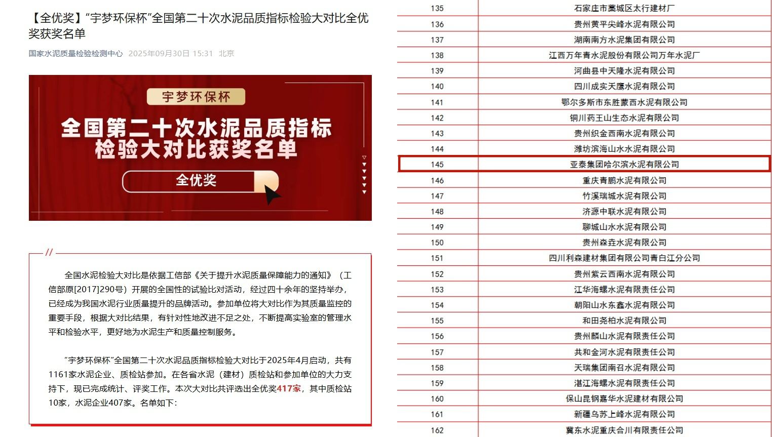 近日,2025年“宇梦环保杯”全国第二十次水泥品质指标检验大对比结果揭晓,亚泰集团哈尔滨水泥有限公司凭借精准无误的检测数据与专业过硬的技术实力,再度斩获“全优奖”。亚泰哈水连续多年获此殊荣,用持续稳定的卓越表现,彰显了公司对质量的极致追求与严苛的把控能力。