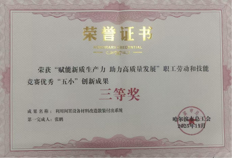 经过基层工会推荐,公司共上报6项创新成果。活动组委会于2025年12月下发了《哈尔滨市总工会关于发布2025年“赋能新质生产力助力高质量发展”职工劳动和技能竞赛优胜单位、引领性项目、工人先锋号、 优秀“五小”创新成果和“安全吹哨人”的通报》。公司共有4个项目获奖,