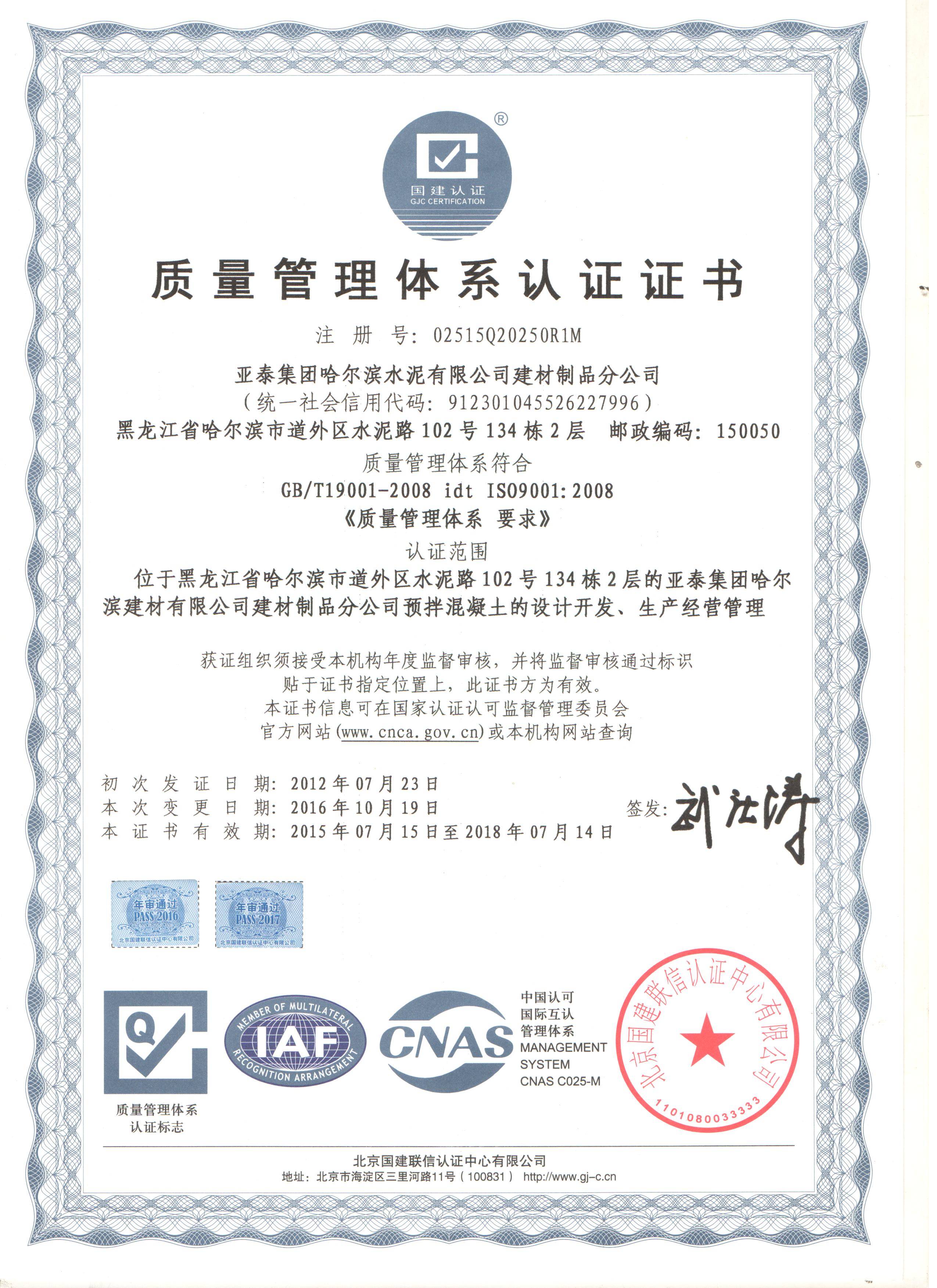 12016年10月,亚泰集团哈尔滨建材有限公司通过了国建联信认证中心ISO9001质量体系认证及产品质量认证年审。此项审查工作,是对企业质量管理工作的充分肯定,公司将以此为动力,进一步提升企业质量管理水平,力争产品质量再上新台阶。