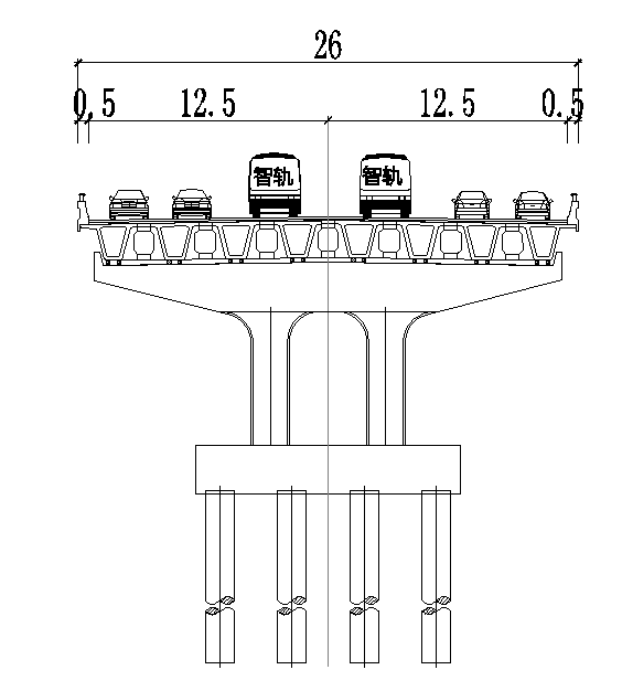 铁路线以西YK线主桥梁长538m,分两幅,单幅桥宽13m,其中在东方大街与铁顺街之间设置上下A、B匝桥,A、B匝桥全长均为150m,全宽12m。跨哈西铁路线斜拉桥全长420m,主跨全宽67m,边跨全宽60m。铁路线以东西站大街至中兴左街市政段桥梁分为三幅,YK线主桥梁分为两幅桥,智轨专用匝桥位于两幅YK线主桥梁中间,YK线主桥梁单幅全宽21.5米,中兴左街至复旦街段市政桥梁YK主线分为四幅桥,两幅YK线主桥梁以及两幅预留引桥,单幅引桥全宽9米,单幅YK线主桥梁全宽12米,位于预留引桥外侧,两幅YK线主桥梁至复旦街前落地,铁路线以东YK线主桥梁长540m。智轨专用匝桥ZK线沿西站大街至哈西客运站前落地,智轨专用匝桥桥长2480米,匝桥全宽11米,曲线加宽段全宽12米。
