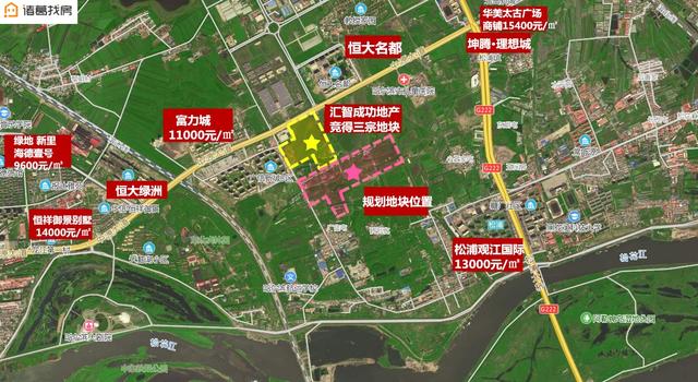 该片区周边较少成熟的居住小区,且在售楼盘分布松散。距离较近的是恒大名都、坤腾·理想城、华美太古广场(商铺均价15400元/㎡)、松浦观江国际(均价13000元/㎡)、富力城(均价11000元/㎡)。从汇智竞得的商住地块楼面价来看,该片区若新添楼盘,预计售价会在10000—12000元/㎡范围内。